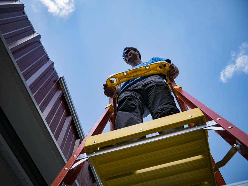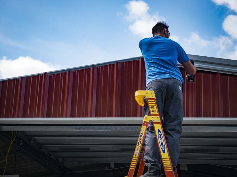 We had a remaining piece of drip edge trim to put up at the roof of our PTR Shop. This involved using theย impact driver to drive the self-tapping sheet metal screws which seat and seal themselves. We brought alongย aย cordless driver, a handful of screws, an extraย bit or two, and a nut driverย to the top of our ladder. At that height we were standing higher than our 12 x 14 Clopay 3720 commercial garage doors.
