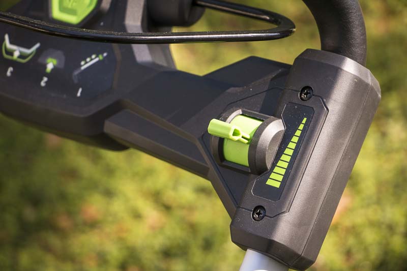 The battery-powered drive system propels the EGO LM2102 mower from 1.8 MPH to 3.6 MPH. Just setting the sliding speed control lever on the left and grasp the side-mounted trigger handle with your left hand.