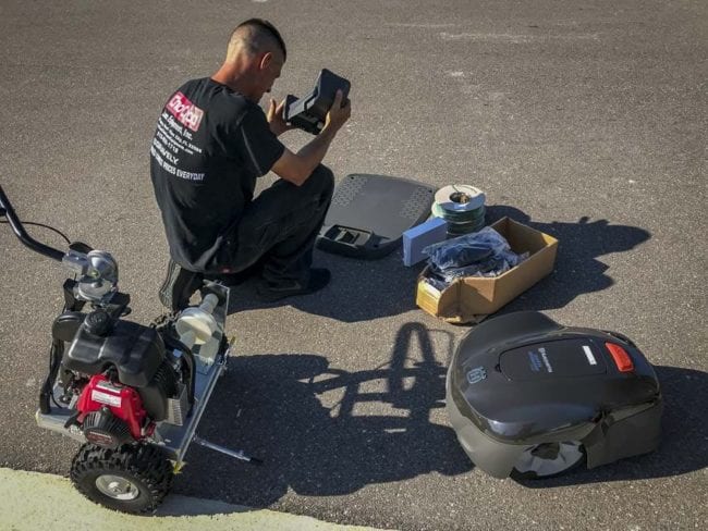 I connected with Jesse from Choo Choo Lawn Equipment in Plant City, Florida to cover the installation of our Husqvarna Automower 115H. You can do the installation yourself, but working with a dealer brings in their perspective and eye for getting the best setup. They also have a machine that buries the wires, giving you a cleaner install.
