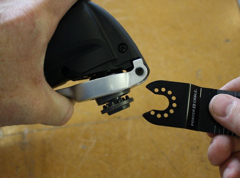 Theย Porter-Cable PC250MTK Oscillating Multi-Tool Kit come all packaged upย inside a sturdy black plastic tool case that has room to store theย tool along with a decent collection of included accessories. Theย overall body of the tool is made of gray glass filled nylon with about 75% ofย the outside covered with rubber overmold. When we initially pulledย out the tool we were shocked to find a 10 foot long cord tucked inย the tool case. The long cord means that you will probably be able toย work on most things without having to use an extension cord. Theย PC250MTK comes with a 2.5 amp, high-torque, variable-speed motor thatย is controlled by a dial towards the back of the tool. The variableย speed control allows for anywhere from 10,000 to 20,000 oscillationsย per minute (OPM) and provides 2.8 (total) degrees of oscillation. Theย on/off switch is a sliding type that is located near the front top ofย the tool which puts it in easy reach for when you are holding theย tool around the middle. Now, where this oscillating tool is differentย than all the rest is the tool-free blade change system. Simply giveย the spring-loaded metal arm on the bottom of the tool a squeeze andย you can pull out the accessory from the collet. The accessories eachย have nine holes that line up with the taped pins inside the collet.ย The pins in the collet are tapered so that, as both the tool and theย accessories wear, they will always retain a tight fit and maximizeย the amount of torque the motor transfers to the blade. The blades canย be adjusted and locked into 30 degree increments depending on howย they are inserted into the collet. The best thing with this tool-freeย system is that there are no removable parts, which is good for meย because I tend to lose small things.
