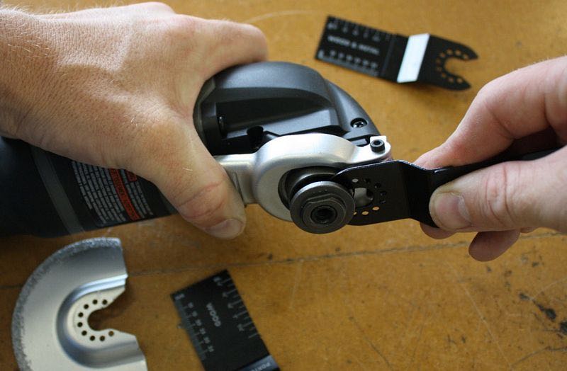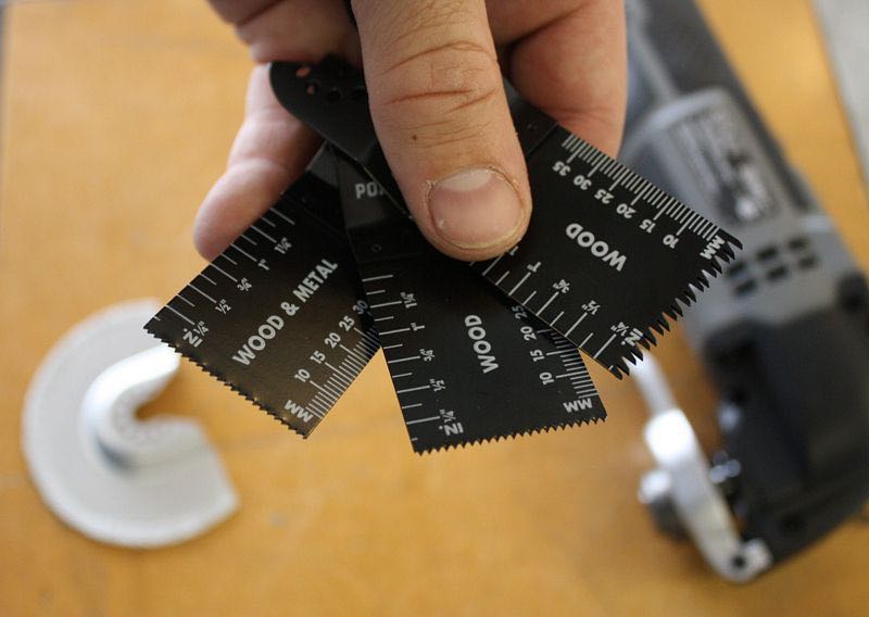 Asย with any multi-tool, it is only as good as its accessories. Theย variety of blades and accessories that are available right now isย adequate for most projects and materials. We suspect that as demandย for certain specific types increases, Porter-Cable will deliver. Theย overall quality and functionality of the Porter-Cable accessoriesย seem to be of pretty good quality apart from the labeling. Weย particularly liked the dedicated coarse wood plunge cut blade thatย had very large teeth and worked incredibly fast. As a fun side note,ย we were able to easily fit the Porter-Cable blades on other brands ofย multi-tools thanks to their hole placement being the same layout as aย few other manufacturers. In the photo we placed a Porter-Cable woodย blade on a Milwaukee multi-tool via a universal adapter. Here is theย current list of available accessories along with their model numbersย and suggested prices.