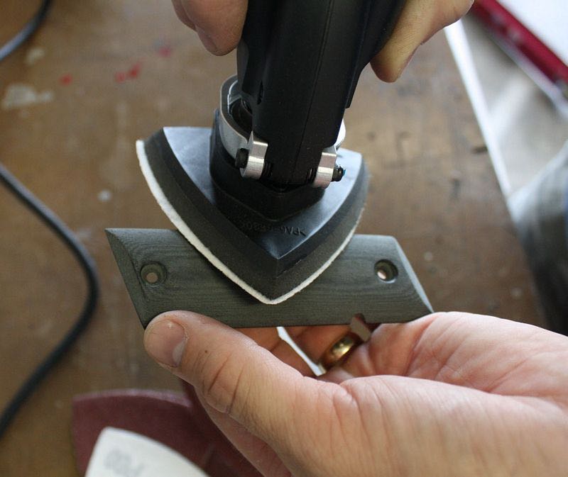 Usingย the hook & loop sanding pad and sand paper on low speed to sand some wooden handgun grips
