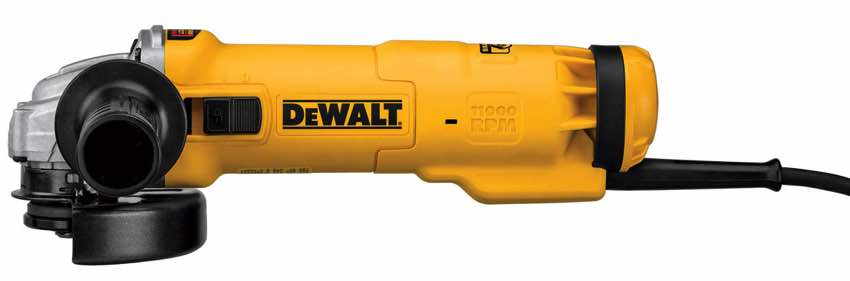 The new DeWalt DWE4222, DeWalt DWE4222N, and DeWalt DWE4224 small angle grinders replace the DeWalt D28402 and DeWalt D28402N with some new upgrades. For starters, all three new DeWalt small angle grinders feature a Lanyard Ready Connection. This is a solution for the OSHA tethered tools requirements and comes in the form of a handy loop at the base of the tool. It gives the operator additional safety and comfort when working at heights. Also, the models also feature an improved brake which stops the wheel 50 percent faster on average than their previous line of angle grinders.