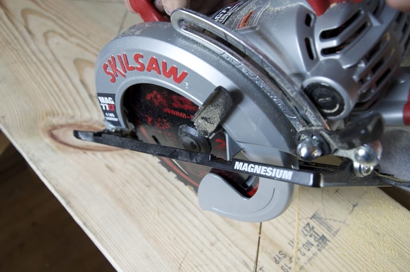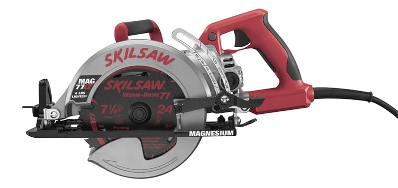 Itโs definitely the lightest saw on the market. Skil shortened the body casing, so the balance on it is really great. It has a cast magnesium shoeโgone is the stamped aluminum and steel. I actually found that I could rig it up and use the MAG77LT as a poor manโs track saw quite easily. The older saws didnโt ride as nice against my makeshift plywood fence compared to the new one. This is because the stamped shoes had like a 3/8โณ radius, while the Skilsaw MAG77LT sawโs cast base is really squared up nice and tight.
