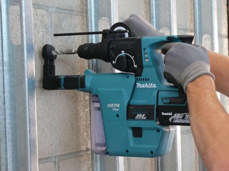 Several of Makita’s brushless rotary hammers will now come OSHA Table 1 compliant out of the box. They make it happen by including a dust case that has an integrated filter cleaning mechanism and a HEPA filter. Now you can drill and chip away without worrying about other methods of staying under the PEL.