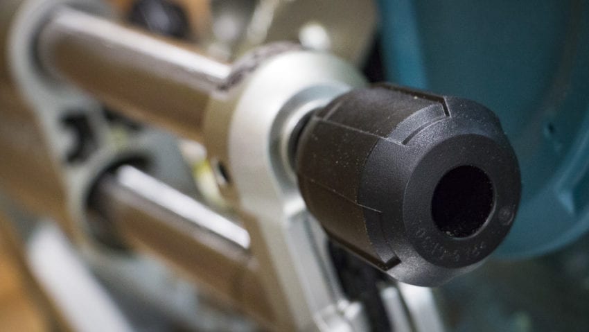 The Makita 10โณ cordless miter saw takes advantage of a laser to mark your cutline or adjust for blade-left/blade-right cutting. You can turn it on or off using the power switch on the top of the handle. But pay attention โ you have to turn it back off to avoid draining the battery while itโs not in use. Granted, that will take quite a while with a pair ofย 5.0AH batteries.