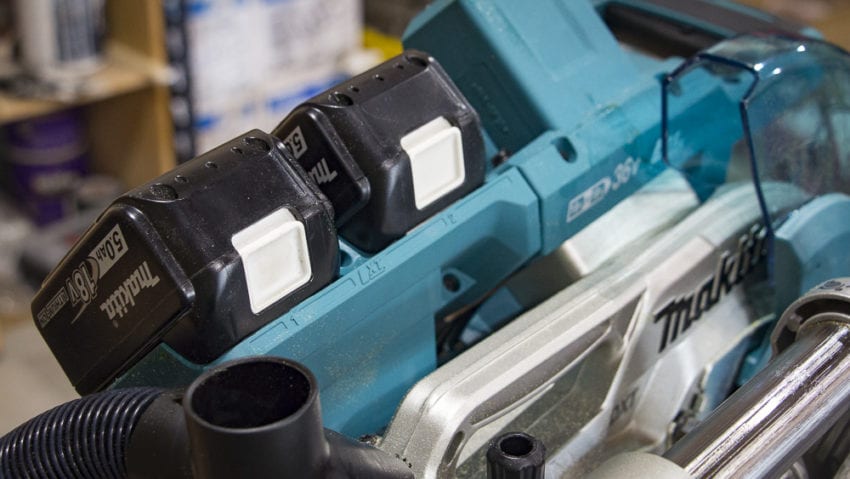 Makitaโs BL brushless motor gets its power from a pair of 18V LXT battery packs. The serial connection between them inside the tool creates a 36V saw with the power to drive a 10โณ blade effectively.