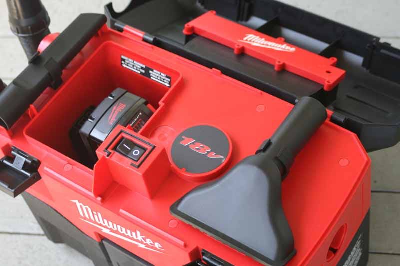 Itโs truly a portable tool and this seems to be one of its major strengths. Lifting the top lid, which is secured with two black plastic latches, the M18 Wet/Dry Vacuum reveals a narrow crevice accessory as well as a mini floor nozzle. Both accessories remain easily and securely attached to the top of the vacuumโs motor housing when not in use. The on/off switch is raised and penetrates the top lid, allowing for easy power up and down of the vacuum. Itโs a large switch and quite easy to use with gloved hands. Close the lid and you can pretty much toss this tool in the back of the truck, or even stack some items on top.