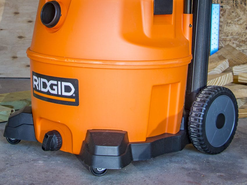 Mobility:ย The Ridgid 16-Gallon Wet/Dry Vac uses the typical combination of two front swiveling casters and two larger back wheels. The back wheels will allow you to roll over extension cords and other debris that caster-only models tend to stick on. While these wheels are acceptable in their ease of rolling, youโ€™ll find brands with higher quality sets.