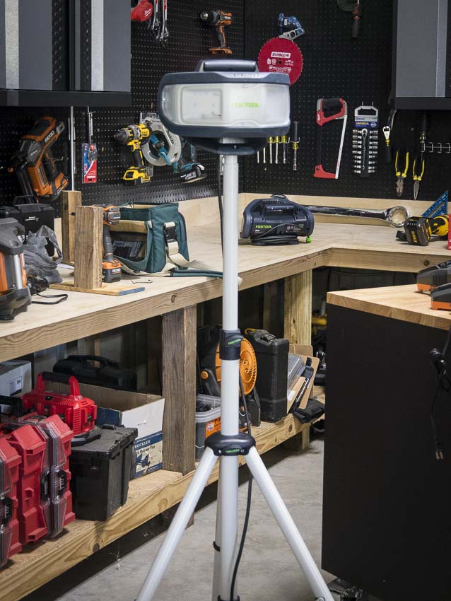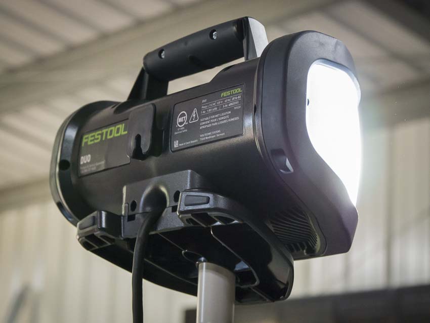 You can get the Festool SysLite DUO-Plus Work Lite as a standalone tool with a Systainer 3, or you can opt for the Festool SysLite-Set. That includes a Systainer and also the ST DUO 200 tripod. With the ST DUO tripod you can elevate the SysLiteย over 6 feet in the air and aim it as needed. It also locks the light in place so it doesnโ€™t swivel on you (or come off) once you have it positioned. We were also pleasantly surprised when the 16.7 ft. long cord had a good amount of reachโ€”even when the light was maxed out on the tripod.