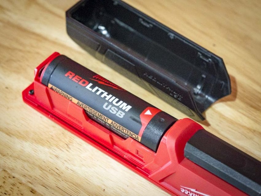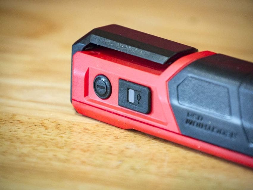 The Milwaukee Rover Pocket Flood Light battery can be recharged on board via the micro USB port just below the power button. If you need to swap batteries, the access door is below the clip. Itโ€™s on the tough side to open since it fits pretty tight. It also doesnโ€™t slide all the way off like youโ€™d expect. It pulls back about half an inch, then needs to be lifted up. Itโ€™s more noticeable when you replace the door since you have to seat it in a forward position before sliding it closed.