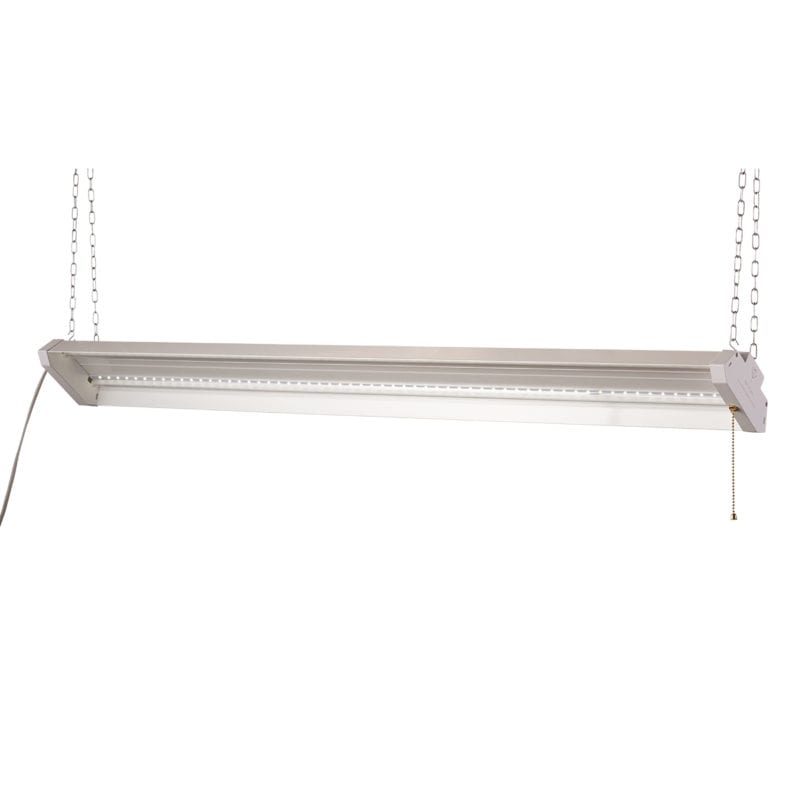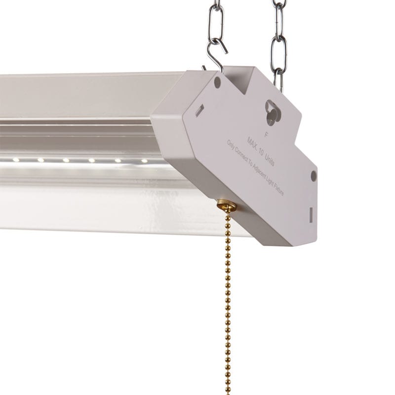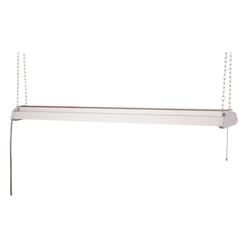 With a light output of 4,500 Lumens, this new LED shop light has a lighting range of 15 ft. It features a polycarbonate lens to help with light clarity and unit durability. Like you might expect, this model also features an on/off pull chain.