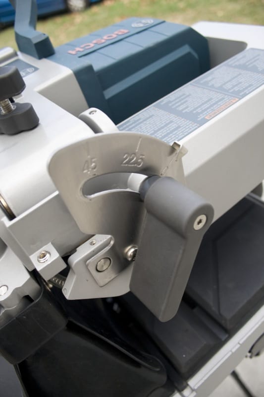 I measured the accuracy of the saw components as set by the factory, and I was generally impressed with what I found. The inch scale on the fence of the rolling table was right on as were the 22 1/2-, 45-, and 90-degree bevel angle settings of the saw head. If the angles ever drift, there are adjustable stops for both 90 and 45 degrees. The fence stop device that clamps to the fence for making repetitive cuts had accurate inch marks, but the 45-degree setting on its protractor was a bit off.