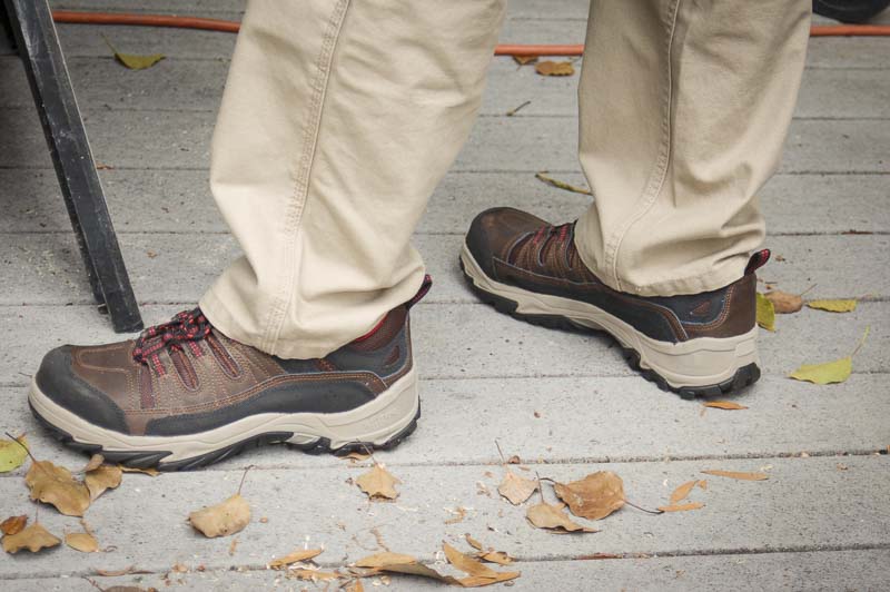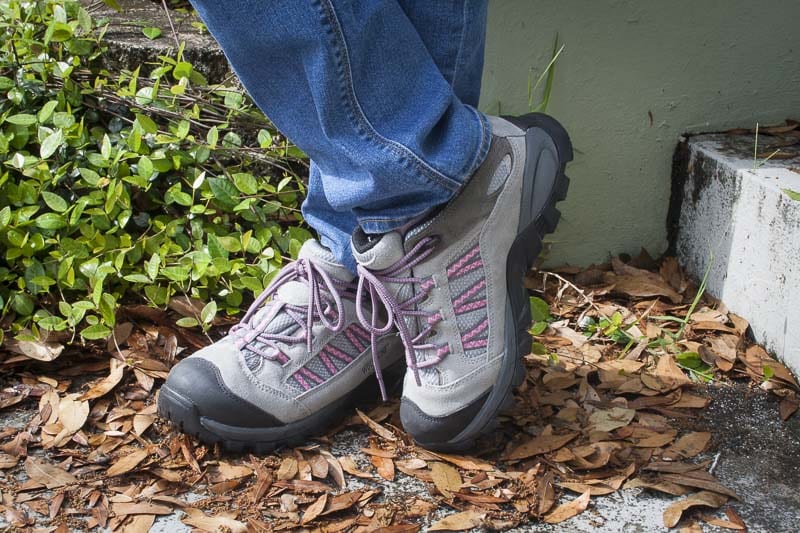 I wanted to also get something in that could be worn by women, and I had access to a pair of feet that happened to beย attached to one! Theย Womenโs Black Ledge FX Low Hiking Shoe (Wild Dove/Pink) was a great choice, and itโs a nice pair of composite toe shoesย that look great for casual or business casual use. These affordable ($55) shoes featureย a full-grain leather and fabric upperย with a moisture managing mesh lining that keeps your feet from perspiring.ย A compression molded EVA footbed and midsole withย rubber outsole makes these as comfortable to walk on as they are durable. They flex nicely when walking, and we found them to be very good for womenย who will be on their feet for a good portion of the day. Since they lack a composite toe, these shoes are nice and lightโcontributing to their comfort.