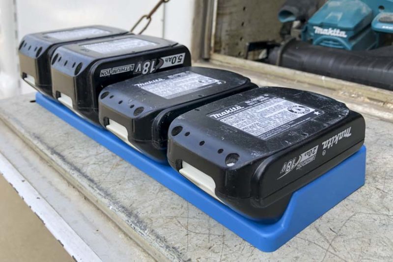 Makita’s holders are super easy. The size of the entire 18V LXT battery range is so consistent that there’s no issue putting any of the batteries right next to each other or inserting and removing them.