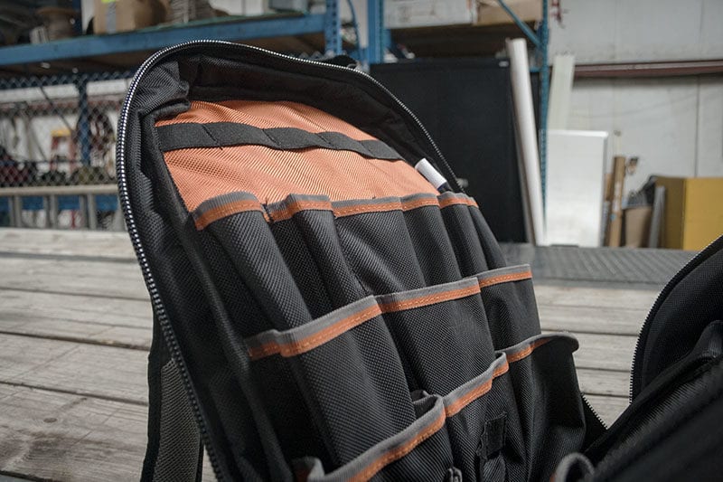 After a short time, I found that dedicating a tool to a specific pocket allowed me to work quickly, as well as allowing me to see if anything is missing at a glance. The bright orange interior, coupled with the orange stripes across the black tops of the pockets, assist greatly with that. We often lose screwdrivers because we think they’re in our normal toolbag when we leave a job – but, often, they’re not. With just a little discipline, the Klein Tradesman Pro Tool Backpack remedies this problem, allowing me to spend a larger percentage of my work day actually working!