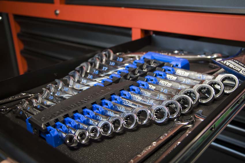 On the base cabinet is the previously mentioned power strip. Each of the 12 total drawers is rated for 100 pounds of storage. The deeper bottom drawer is separated into a bulk storage space and cordless tool organizer with space for three drill/driver/impact style cordless tools.