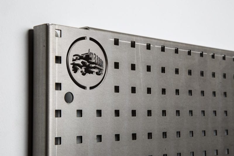 It starts with 14-gauge, laser cut steel sheets. Square 1/4 inch peg holes are centered 1 inch apart from each other. The obvious benefit here is a much stronger, more permanent storage solution that isnโt affected by water the way peg board is.
