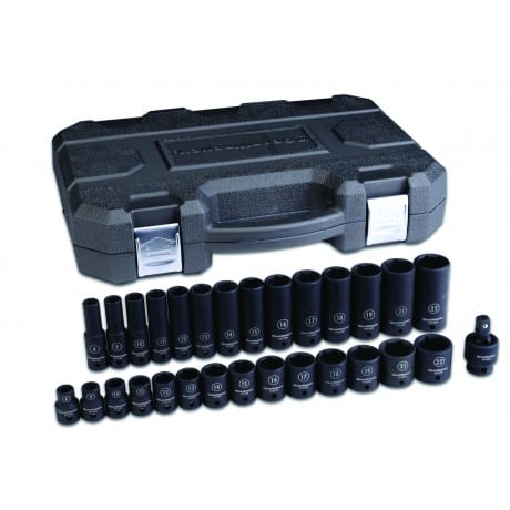 The new GearWrench impact socket sets are made from impact grade chrome molybdenum alloy steel for exceptional strength and durability. To reduce rust, the sockets are coated with corrosion resistant manganese phosphate. The sets also feature high-visibility laser-etched and secondary hard-stamp markings for quick and permanent size identification. ย GearWrench also designed the sockets with surface drive technology that reduces fastener rounding. Larger GearWrench Impactย Sets includes a blow mold case with reinforced steel hinges and steel buckles for strength and security. Smaller sets will come on a storage rail.