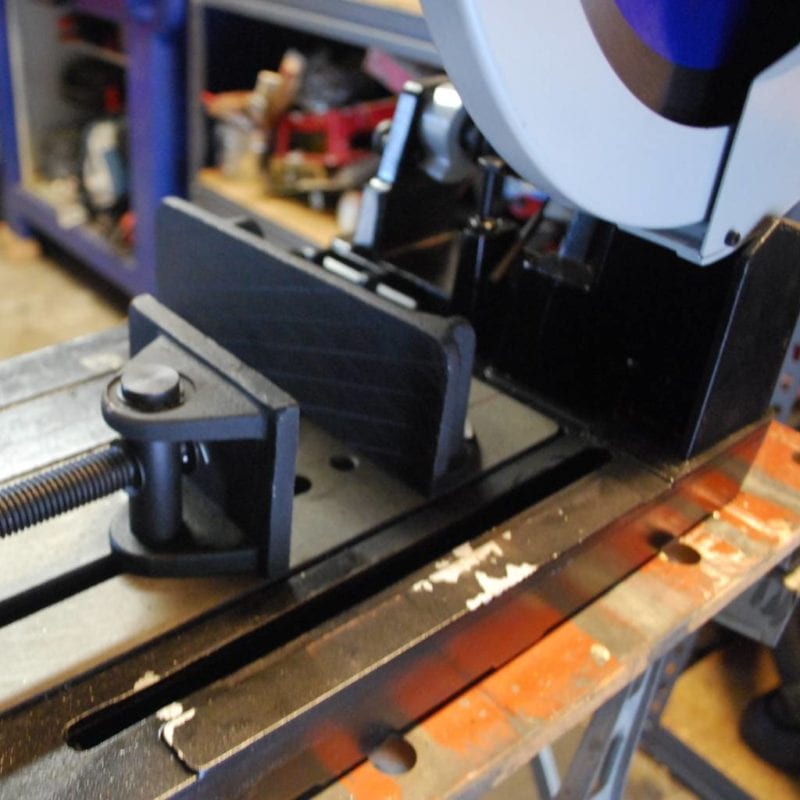 I setup the Evolution EVO 380 Raptorย steelย cutย offย saw on a workbench in my shop and got to work cutting out all the various table frame support pieces and legs. ย My first impression was: This is definitely the right tool for the job. This saw is a beast. ย It cuts steel just about as quickly as my chop saw cuts a 2ร4! I was thoroughly impressed with the powerful and dry-cutting clean design. ย The sawโs special carbide tipped bladeย executed each cut with a high level of precision I didnโt expect, and the blade left my work pieces clean and ready for welding. Thee were almost no burrs at all. ย This saw is effortless and throws off very little mess and minimal sparks, ideal for working in mildly hazardous areas where heavy sparks could start a fire. As mentioned above, Evolution put a handy pull-out collection tray in below the cutting deck to collect most of the shavings and it works rather well. ย Also, the clamps on the cutting deck are heavy duty and fantastic at securing the workpiece.