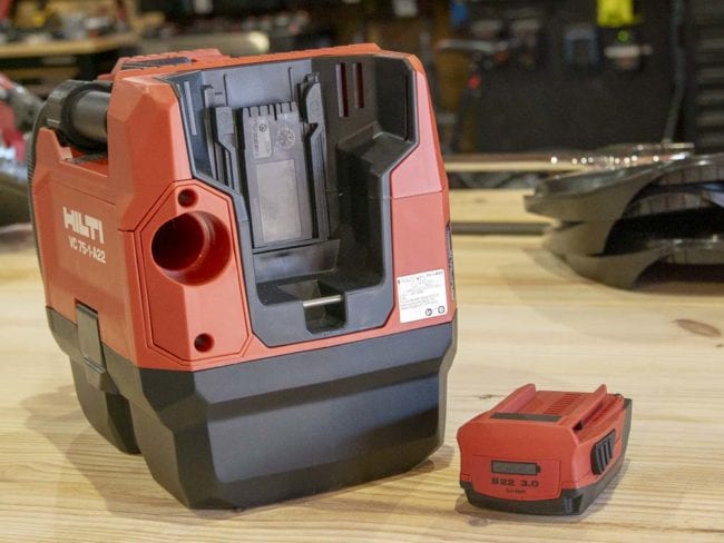 Like Makitaโs new 18V model, this Hilti cordless vacuum has two modes โ Max and Eco. Max will net you 75 CFM โ a very impressive number to hit without going up to a 36V platform.