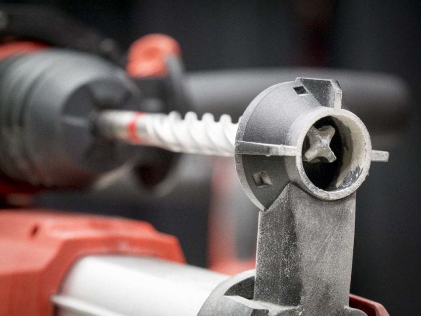 We got our Hilti TE 6-A36-AVR with an optional TE DRS-6-A onboard dust extractor. This vacuums dust at the penetration point, but our pre-September 23rd selection may have been a little premature. The lack of a filter cleaner means itโs not Table 1 compliant. Be sure to grab the T1 version โ it has a manual filter cleaner on the base that brings you into compliance.