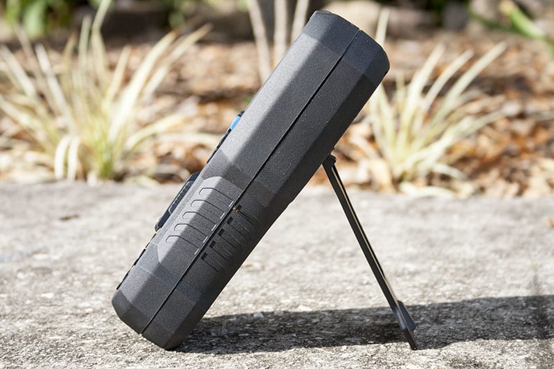 Handy features include a kickstand, an LED work light, and an optional lead holder that screws into the back which also contains a magnet for sticking the meter to the inside of a service panel. Thatโs really a nice touch.