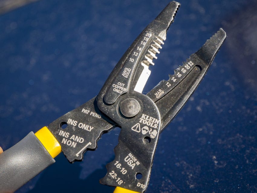 Inside the jaws, just behind the stripping gauges, Klein includes a precision cutting shear. Like wire stripping, you can handle the same range for cutting โ€“ up to 10 AWG solid or 12 AWG stranded.
