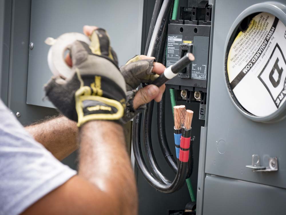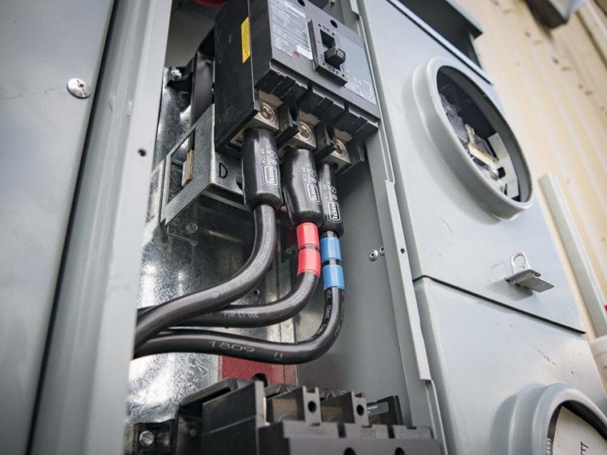 We’ve been installing 600-amp service to a large metal building for several weeks now. Today, the Milwaukee M18 Force Logic 750 MCM Crimper will help us connect several 3/0 pin terminal connectors at the meter bank. Misael has mastered the art of neat service panel organization, so he set to work preparing all the large diameter cables. In this way, we could test the Milwaukee on individual crimps as well as serial crimps. You’ll see that he marked the phases with colored tape and bent the cable into its final direction – no easy task!