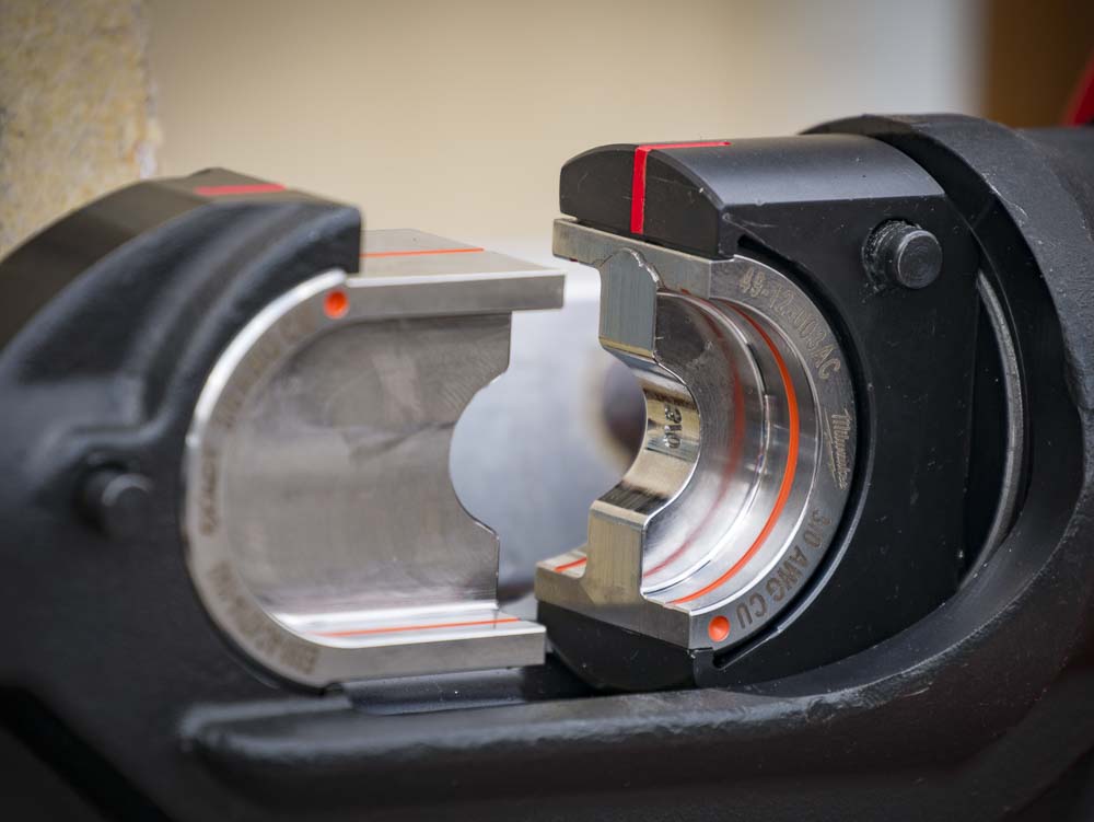 Misael was kind enough to let me take the Milwaukee for its inaugural crimps. I slid the correct die into the jaws of the crimper’s rotating head and they clicked into place. They remain secure in the jaws until the release button is depressed – otherwise, they’d fall out as head rotated! As I mentioned above, this crimper is lighter and more compact than any other tool for the job – but it’s still heavy. You’ll notice, however, that it’s perfectly balanced such that the weight doesn’t interfere with positioning.