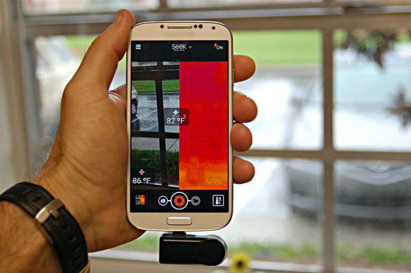 The FLIR One made a huge splash last year when it came out with the iPhone 5/5s based system. Sadly for all smart phone users that werenโt on the 5/5S platform, we were left wanting. Thatโs where the Seek Thermal camera comes into play. Rather than connecting to your phone like a cover, it simply attaches via your micro USB connection on many Android and Apple phones. The free app then takes care of the rest.
