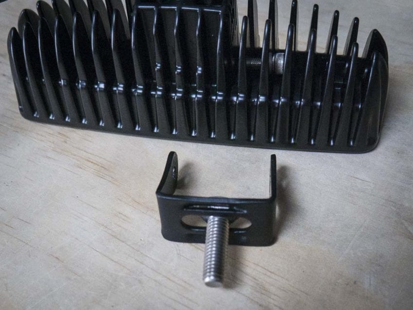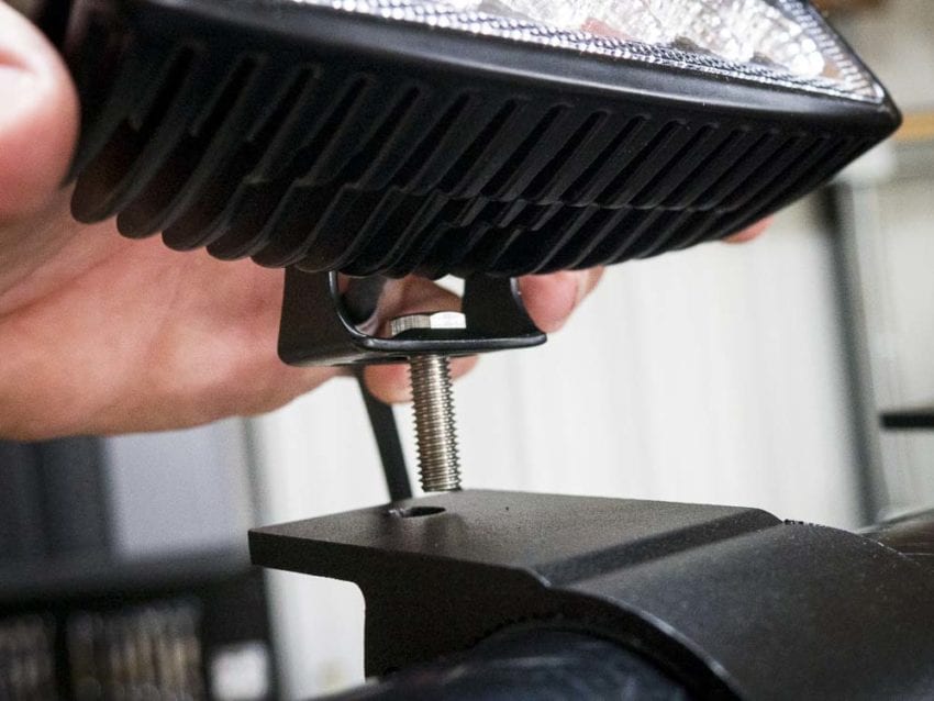Next, itโs time to assemble the lights and brackets. These brackets hold the LED lights to the mounts we just installed on the ROPS. Each LED needs to have the U-shaped brackets attached. To do this, make sure you place the stainless bolt (hex bolt) through the U bracket before attaching the bracket to the LED. I didnโt the first time, so I had to backup and start over.