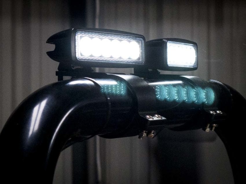 Even with the LED lights blazing in the shop, I still had doubts if the two LED lights can provide enough light to mow in the night. Again, my doubt is quickly extinguished with the performance of just the two LED lights shining like a beacon in the night. Atop the ROPS bar on the Exmark Radius, that mower LED lights throw the light over the operatorโs head and onto the lawn in front. Itโs easy to see debris and undulations with these Exmark mower LED lights. We tried it under a couple big oak trees as well as in the open lawn. The LED lights perform very well on the Exmark, and we would definitely recommend this LED light kit from Exmark. Find your Exmark dealer here, and ask for the 126-5582 LED light kit.