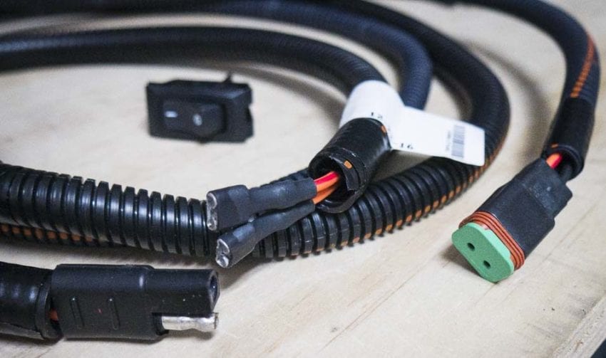 We need to tap into the electrical or battery wiring, and there are a couple of areas to do this. The one we found was near the left side of the mower, in the engine compartment. Just follow the wires, theyโll lead you there. Plug the LED light wiring harness into the newly found 12V-ignition source. There should only be power to the lights when the key is in the โOnโ position. Finally, plug the two waterproof plugs (with green ends) into each LED light.