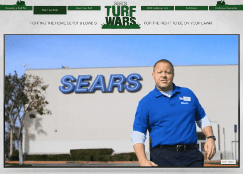 Itโs on! Sears started a campaign Sunday starring John Lacy that literally calls out Home Depot and Loweโs in an effort to take them on directly in the battle for lawn care product sales supremacy. Itโs like a schoolyard fight: meet me in the parking lot at 2 PM! The actual words are more like โSears Turf Wars, fighting the Home Depot and Loweโs for the right to be on your lawnโ but you get the ideaโฆ or maybe you donโt.