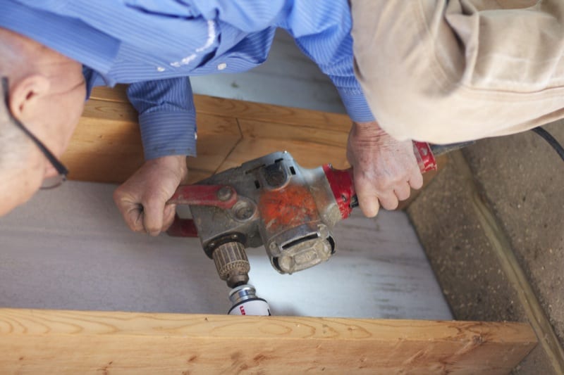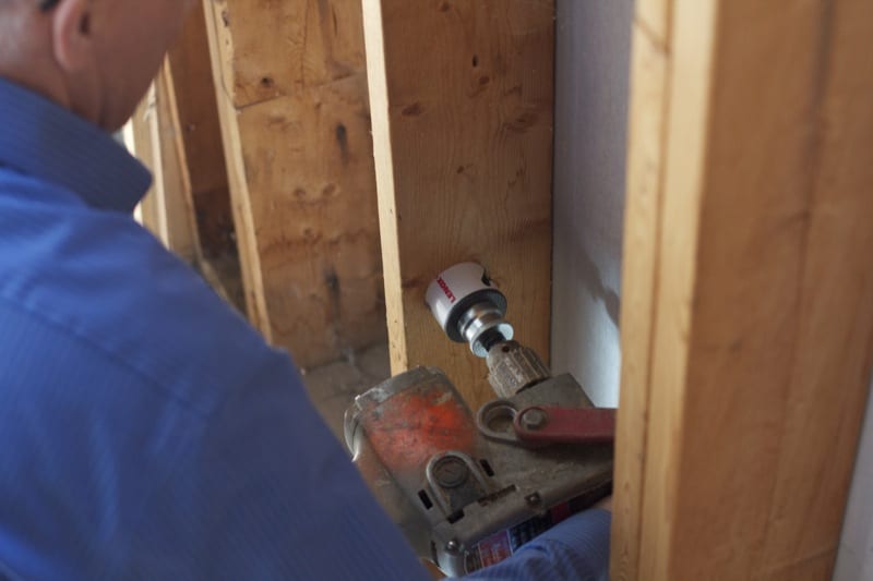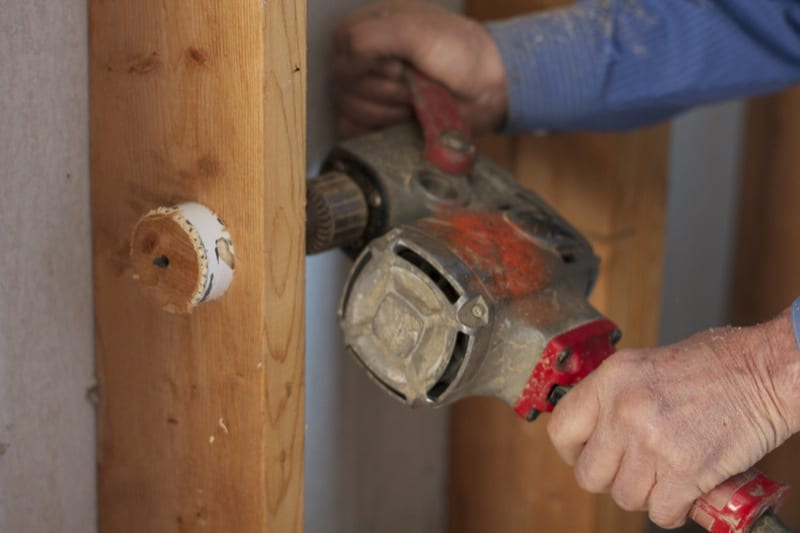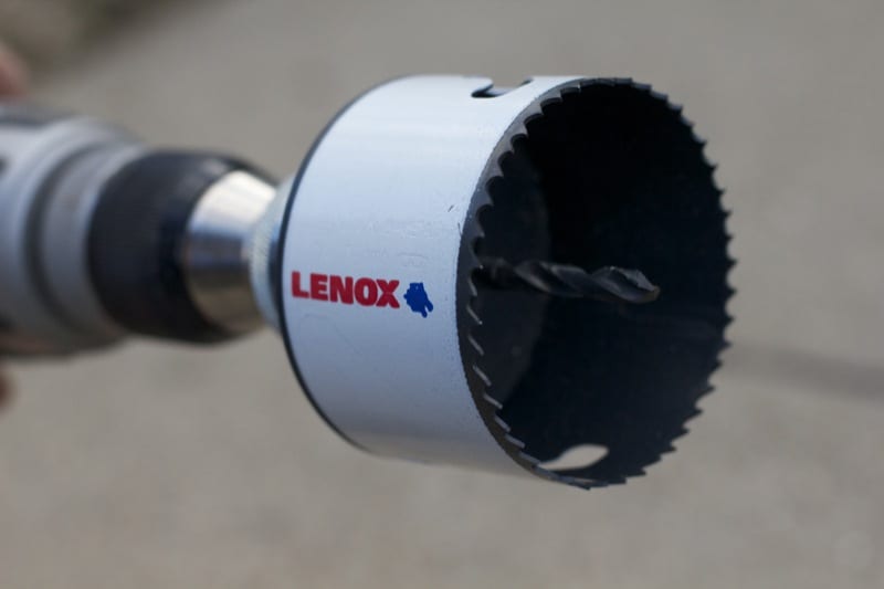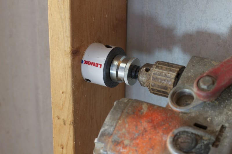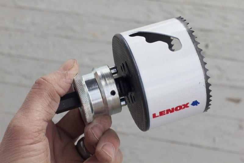 I also noticed right away that this Lenox 17 Piece Plumbers Hole Saw Kit comes with the โquick changeโ arbors. If you havenโt used these before, then let me tell you they are a snap to useโฆliterally. Instead of tightening down the saw bits on threads with pliers, they have a sliding arbor that lifts and turns into place, locking the bit with two pins andโbest of allโno tools. The 3 smallest bits use a similar design that catches two flattened grooves instead of the 2 pins. Because Lenox used an arbor that relies on the pins to drive the bit rather than the threads, you no longer need to worry about stripping them. Already, Iโm getting excited about testing these outโand for me, thatโs saying a lot. The first hole we cut was a standard 2-ยผโ hole, typically used for running 1-ยฝ โ ABS pipe for a sink drain. A lot of times, especially in new construction, you need to cut through several 2ร4โs in a row to run a length of pipe. The key to a frustration-free job is keeping your blade from overheating (which causes it to dull faster) and keeping it unclogged (which I complained about extensively earlier). I canโt say I was too surprised at how quickly the 2-ยผโ bit made it through the first 2ร4. If youโve used Lenox blades before, then you know they make good quality tools. The bit performed as well as I had expected and made it through the 2ร4 in approximately 15 seconds.