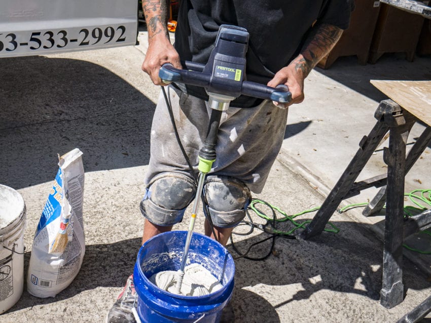 It might also be worth mentioning that the new Festool mixer has a soft-start feature. When I pull the trigger, the mixer wonโ€™t immediately launch into ludicrous speed, which keeps all my material in the bucket rather than spraying it everywhere. Itโ€™s a particularly attractive feature if you do any mixing inside a finished space.