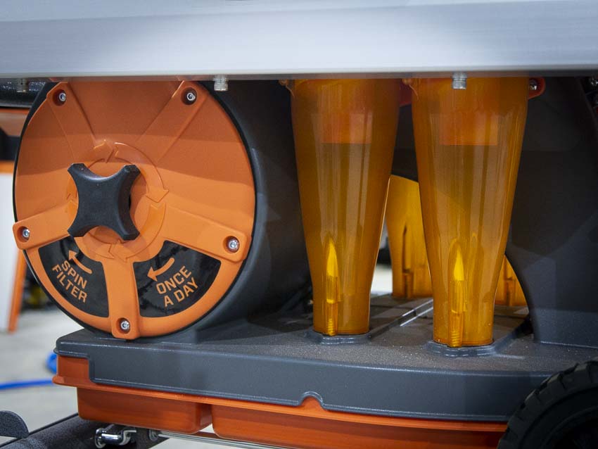We not only had the iQ Power Tools Dry Cut Tile Saw here for review, we also got a chance to spend some one-on-one time with Paul Guth, vice president of research & development for iQ Power Tools. He gave us a quick once-over on the dry cut tile saw and also gave us some insights on some of the design goals. Of primary importance, the iQ Power Tools iQTS244 saw is 100% compliant with the new OSHA standard for respirable silica dust. To accomplish this, it uses a three-stage filtration system to capture up to 99.5% of the dust. You can actually see the three stages since the dust tray is divided accordingly into three sections: