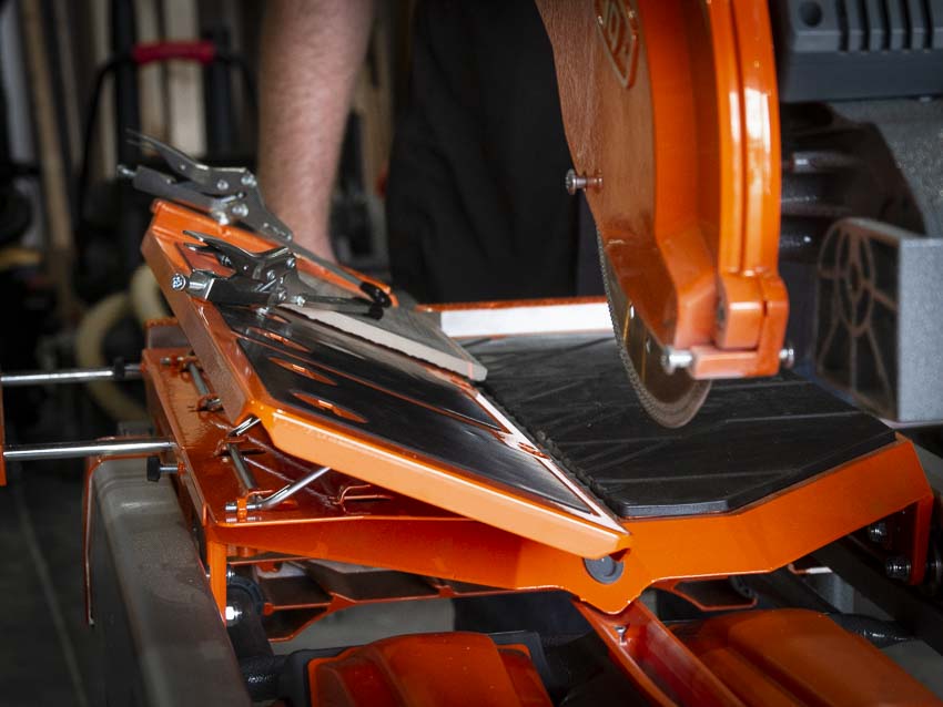 With a tile saw, build quality matters. You need to take the tool on and off the job site repeatedly. You also need to be able to use the sliding table without fighting it. A rough table will yield inaccurate cuts and a miserable time cutting tile. It was for this reason that I actually did a double-take when I spied the underside of this dry cut tile saw. Thereโs more stainless steel in there than in my grandmotherโs hipsโand thatโs saying something. I counted twelve rollers. Itโs no wonder the table slides like glass. Compared to the rough slides on the Harbor Freight Chicago Electric tile saw we used to run nearly a decade ago, this felt like silk.