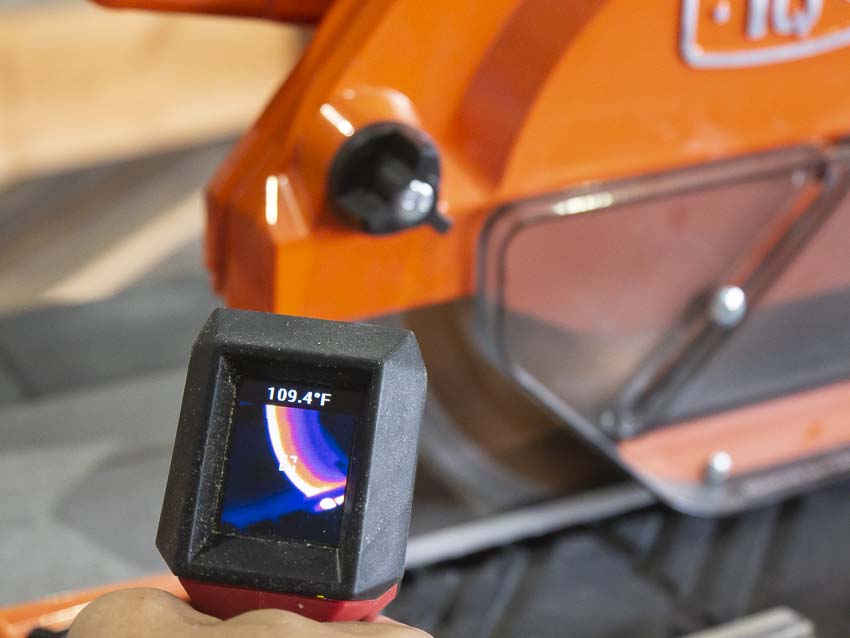 The vacuum not only removes cutting debris, it also cools the specially-designed blade, reducing friction and heat. We put a Milwaukee Thermal imager on the blade while cutting and measured around 109ยบ F after rip-cutting about 8-10 linear feet of tile. Thatโs around hot shower temperature. Needless to say, the blade stays remarkably cool.