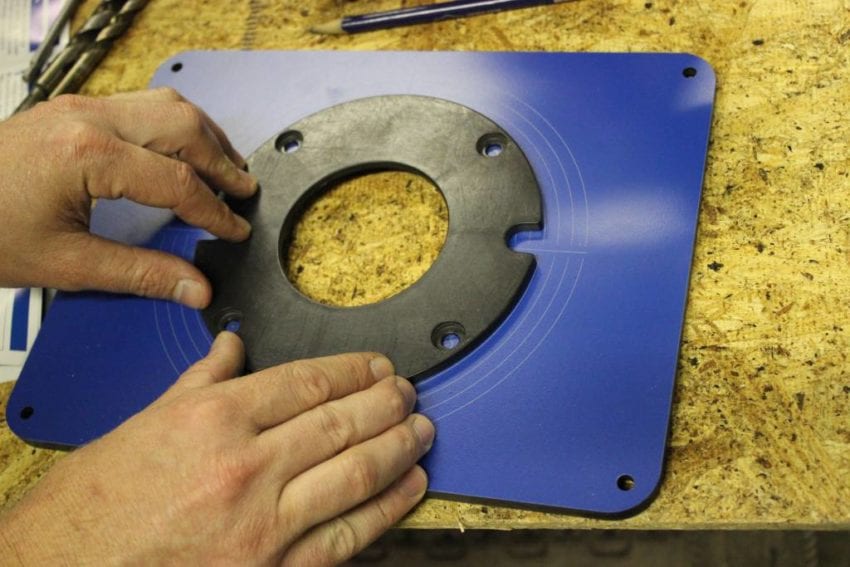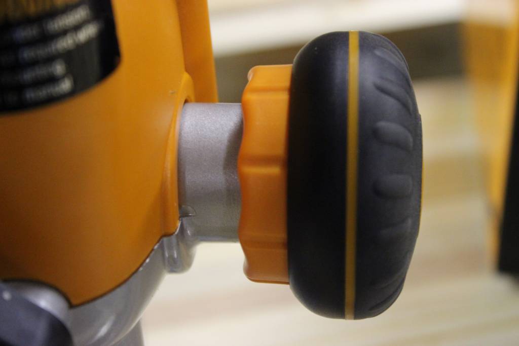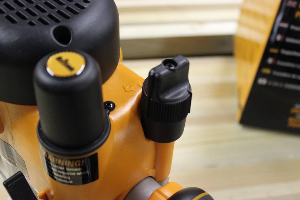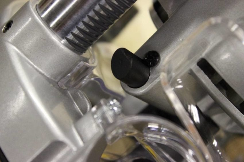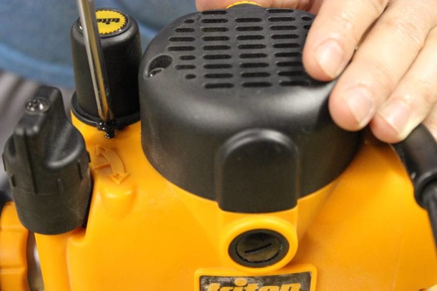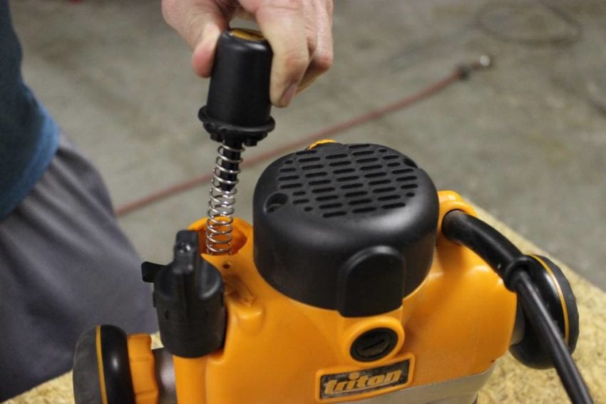 The final position the Triton TRA001 tried out for was the router table. I donโt use my Kreg router table on a daily basis, but it does get a fair amount of use overall and it is currently underpowered with a 2HP router. Aside from the beastly 3-1/4 HP motor, the Triton has three specific features that really stand out in table use: the completely removable spring, the smoothly operating height adjustment, and the automatic spindle lock for single-handed bit changes. My Bosch router has a spring lock for use under the table, but it becomes tricky to engage/disengage when dust builds up under the plate. The Triton spring comes all the way out with one screw. You do have to store the spring, but it feels like a better solution compared to other routers. The height adjustment knob is very smooth and works really well, and when you crank the spindle all the way up, you hit the TRA001โs best โtable featureโ โ the spindle locks by itself. With the collet completely above the table surface, and the spindle locked, changing out bits is very simple. You donโt have to fiddle with holding the spindle lock or using a wrench under the table.