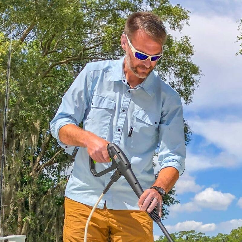 You can get this work shirt in a long sleeve men’s or women’s fit for $59. There’s also a men’s fit short sleeve version for $55. We prefer the long sleeve for the additional sun protection on our arms. You can always roll the sleeves up if you like.