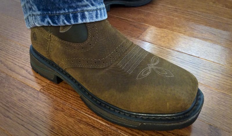 In terms of style, I like the shape and feel of the boot. The steel toe is squared off a bit, but not โbluntโ, so it retains the generally tapered shape of a more traditional cowboy bootโitโs a nice compromise that works. The leather upper is triple stitched under the shaft, which comes in either green or blue (I reviewed the green, which I think is a much more natural-looking color). A six parallel stitching design adorns the shaft in a traditional western style, and two pull straps site atop a split entry that stretches to allow for easier slip-on of the boot.