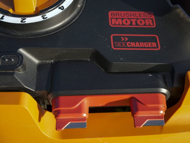 Two contacts on the charging base need to touch the matching ones on the mower. Once they do, it charges automatically. The Worx Landroid L uses the same 20V batteries as their power tools and you can always swap a fresh one in if you want to.
